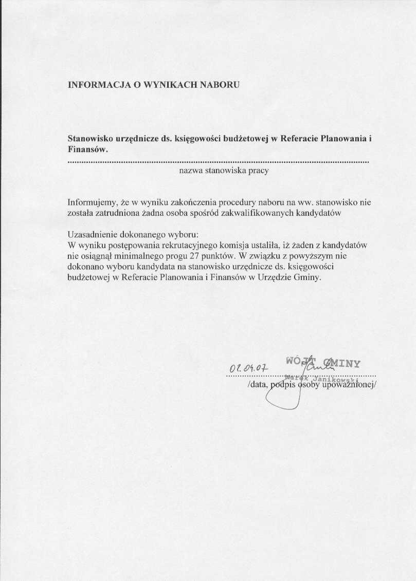 Ogłoszenia: 2007 > kwiecień > 2007-04-04 Informacje o wynikach naboru na stanowisko urzędnicze ds. księgwości budżetowej w Referacie Planowania i Finansów.