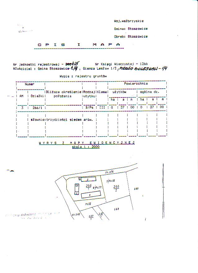 Wójt Gminy Stoszowice zawiadamia, że w dniu 22 listopada 2006 roku o godz. 1040 w siedzibie Urzędu Gminy Stoszowice – sala posiedzeń odbędzie się I publiczny przetarg ustny nieograniczony na sprzedaż nieruchomości położonej w miejscowości STOSZOWICE nr 52, stanowiącej własność Gminy w udziale wynoszącym ¼ część, objętej księgą wieczystą KW NR 1266, składającej się z działki numer 266/1 o powierzchni 0,3700 ha zabudowanej budynkiem mieszkalno gospodarczym i budynkami gospodarczymi.