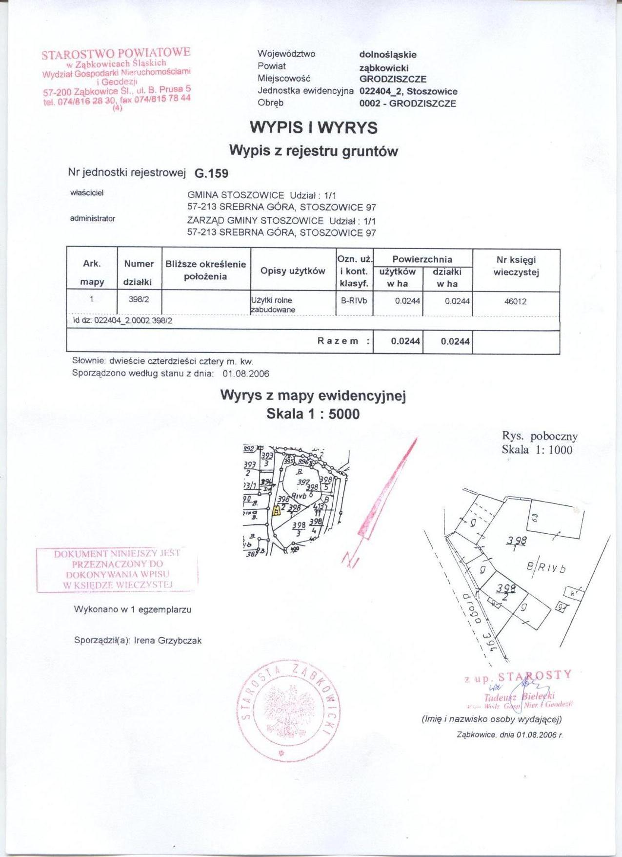 Wójt Gminy Stoszowice zawiadamia, że w dniu 17 października 2006 roku o godz. 1020 w siedzibie Urzędu Gminy Stoszowice – pokój nr 1a, odbędzie się pierwszy publiczny przetarg ustny nieograniczony na sprzedaż nieruchomości położonej w miejscowości GRODZISZCZE, stanowiącej własność Gminy, objętej księgą wieczystą KW NR 46012, składającej się z działki numer 398/2 o powierzchni 0,0244 ha zabudowana ruinami budynku gospodarczymi.