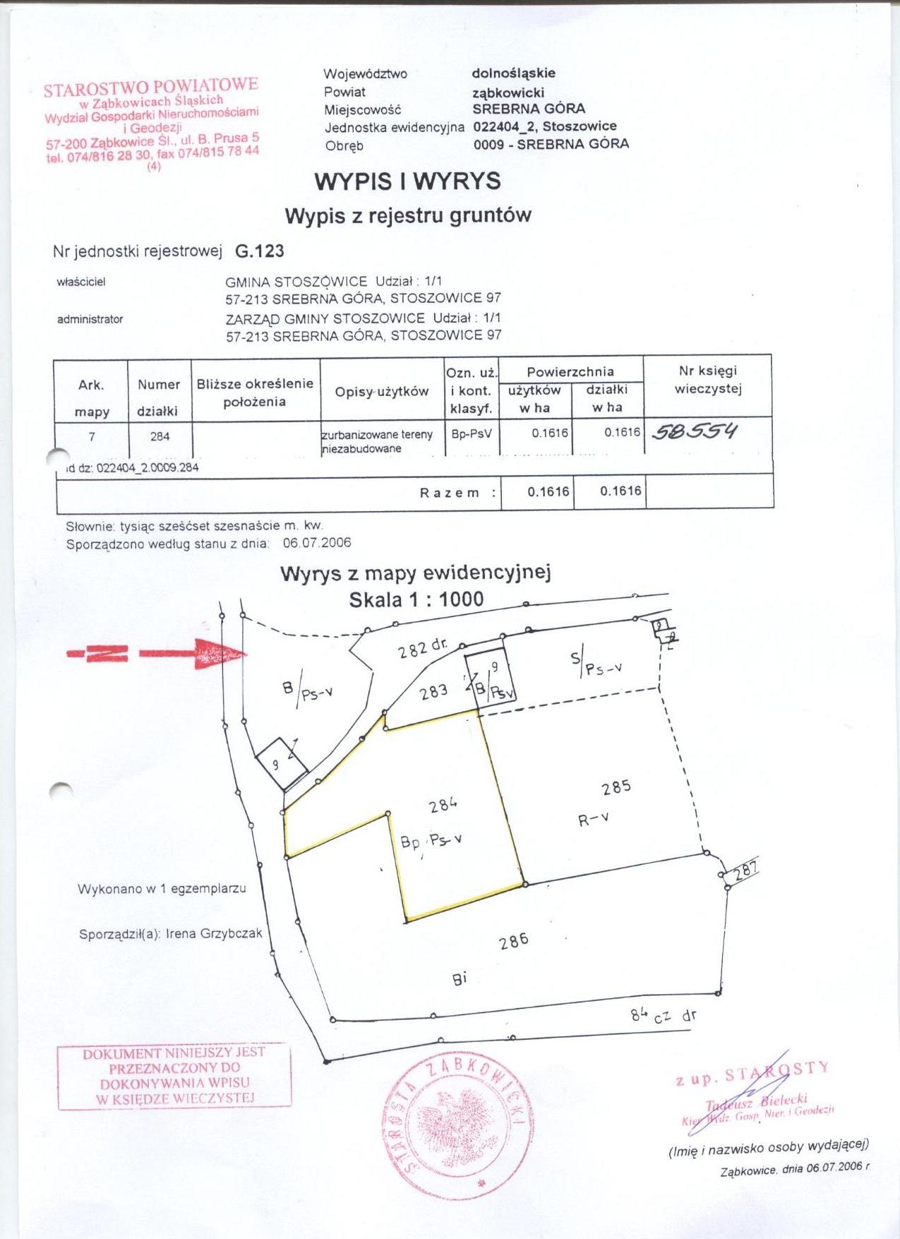 Wójt Gminy Stoszowice zawiadamia, że w dniu 17 października 2006 roku o godz. 1120 w siedzibie Urzędu Gminy Stoszowice – pokój nr 1a, odbędzie się pierwszy publiczny przetarg ustny nieograniczony na sprzedaż nieruchomości położonej w miejscowości SREBRNA GÓRA, stanowiącej własność Gminy, objętej księgą wieczystą KW NR 58554, składającej się z działki numer 284 o powierzchni 0,1616 ha bez zabudowań.