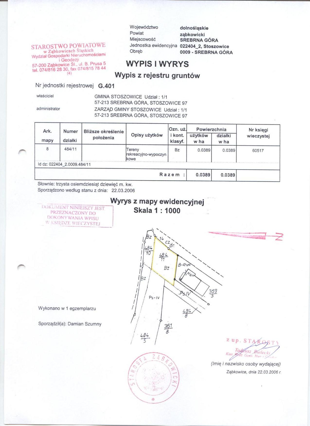 Wójt Gminy Stoszowice zawiadamia , że w dniu 17 października 2006 roku o godz. 1140 w siedzibie Urzędu Gminy Stoszowice – pokój nr 1a odbędzie się pierwszy publiczny przetarg ustny nieograniczony na sprzedaż nieruchomości położonej w miejscowości SREBRNA GÓRA, stanowiącej własność Gminy, objętej księgą wieczystą KW NR 60517, składającej się z działki numer 484/11 o powierzchni 0,0389 ha bez zabudowań.