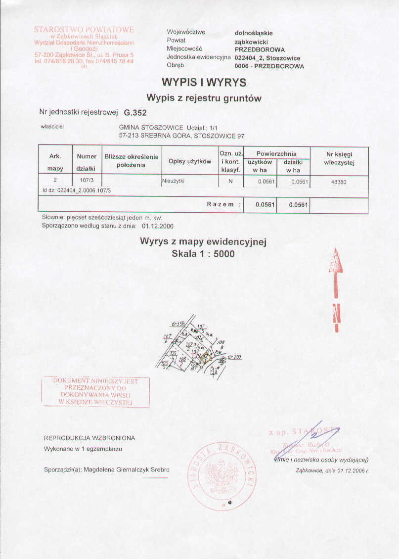 Wójt Gminy Stoszowice zawiadamia, że w dniu 24 kwietnia 2007 roku o godz. 1000 w siedzibie Urzędu Gminy Stoszowice – sala posiedzeń odbędzie się I publiczny przetarg ustny nieograniczony na sprzedaż nieruchomości położonej w miejscowości PRZEDBOROWA, stanowiącej własność Gminy, objętej księgą wieczystą KW NR 48380, składającej się z działki numer 107/3 o powierzchni 0,0561 ha bez zabudowań.