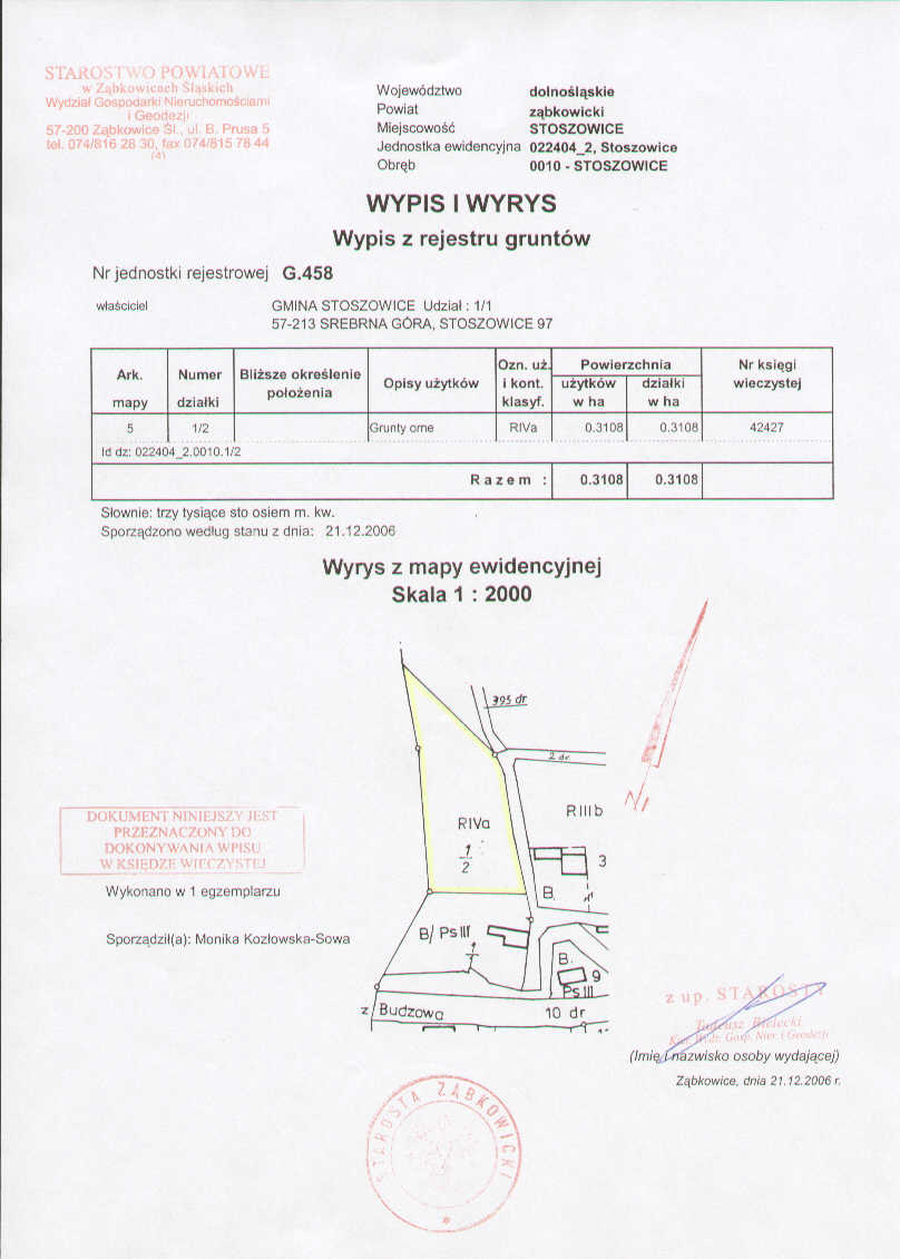 Wójt Gminy Stoszowice zawiadamia, że w dniu 24 kwietnia 2007 roku o godz. 1100 w siedzibie Urzędu Gminy Stoszowice – sala posiedzeń odbędzie się I publiczny przetarg ustny nieograniczony na sprzedaż nieruchomości położonej w miejscowości STOSZOWICE, stanowiącej własność Gminy, objętej księgą wieczystą KW NR 42427, składającej się z działki numer 1/2 o powierzchni 0,3108 ha bez zabudowań.