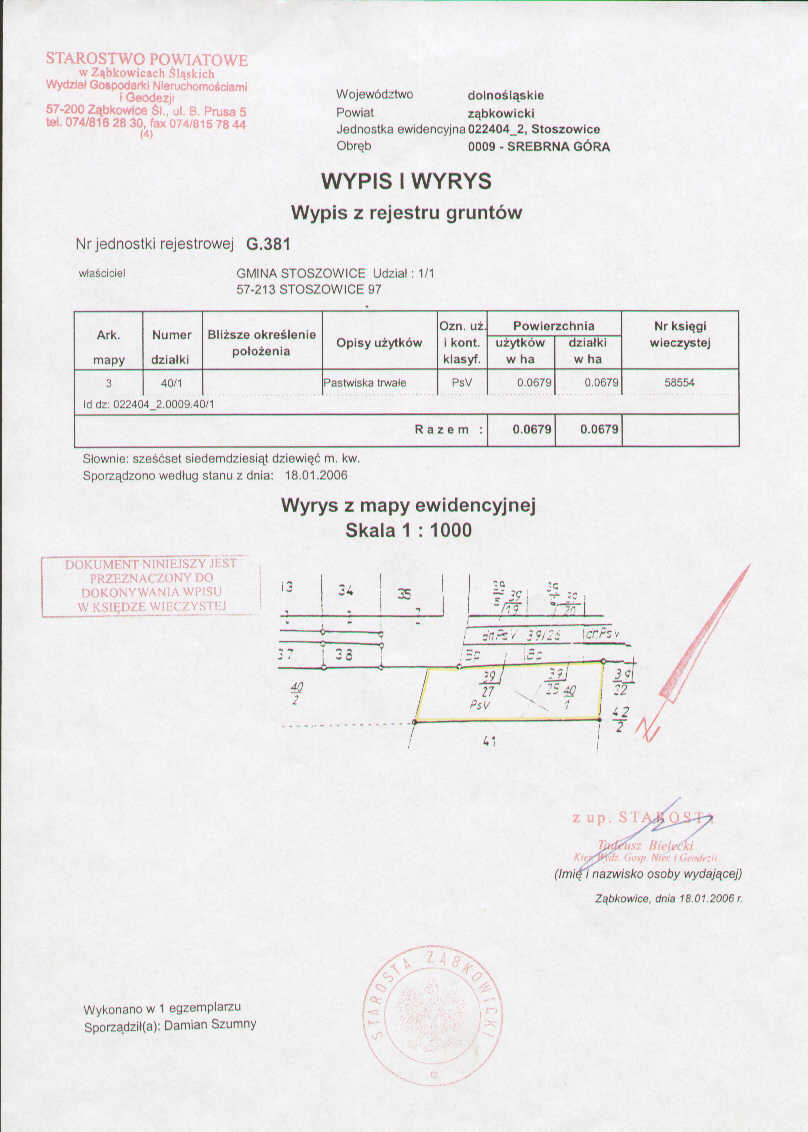 Wójt Gminy Stoszowice zawiadamia, że w dniu 24 kwietnia 2007 roku o godz. 1120 w siedzibie Urzędu Gminy Stoszowice – sala posiedzeń odbędzie się I publiczny przetarg ustny nieograniczony na sprzedaż nieruchomości położonej w miejscowości SREBRNA GÓRA, stanowiącej własność Gminy, objętej księgą wieczystą KW NR 58554, składającej się z działki numer 40/1 o powierzchni 0,0679 ha bez zabudowań.