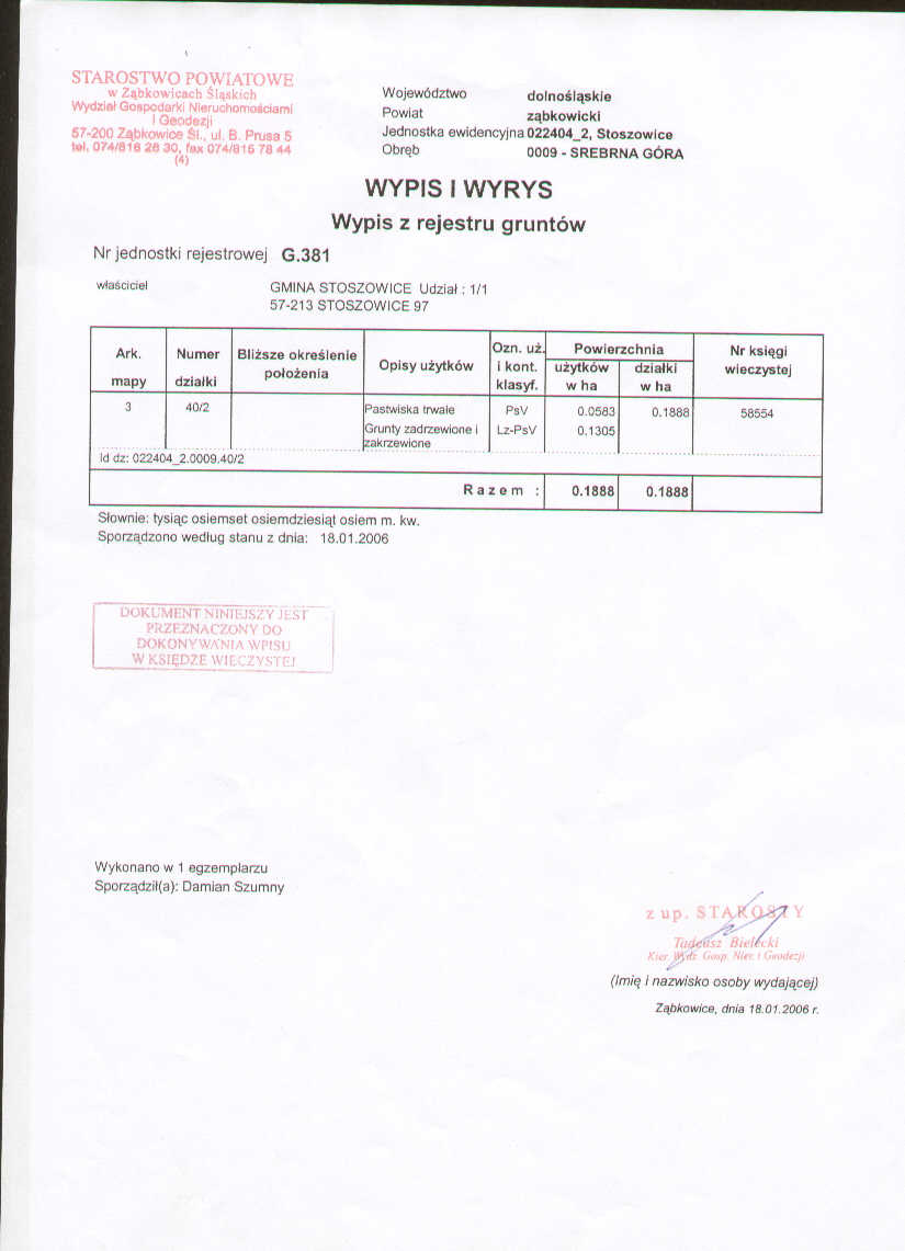 Wójt Gminy Stoszowice zawiadamia, że w dniu 24 kwietnia 2007 roku o godz. 1140 w siedzibie Urzędu Gminy Stoszowice – sala posiedzeń odbędzie się I publiczny przetarg ustny nieograniczony na sprzedaż nieruchomości położonej w miejscowości SREBRNA GÓRA, stanowiącej własność Gminy, objętej księgą wieczystą KW NR 58554, składającej się z działki numer 40/2 o powierzchni 0,1888 ha bez zabudowań.