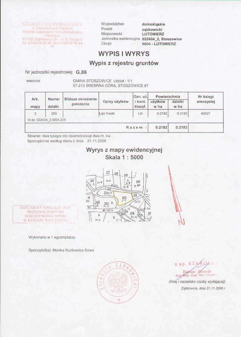 Wójt Gminy Stoszowice zawiadamia, że w dniu 08 maja  2007 roku o godz. 1040  w siedzibie Urzędu Gminy Stoszowice – sala posiedzeń odbędzie się  I publiczny przetarg ustny nieograniczony na sprzedaż nieruchomości położonej w miejscowości LUTOMIERZ, stanowiącej własność Gminy, objętej księgą wieczystą KW NR 42627, składającej się z działki numer   205 o powierzchni 0,2182 ha bez zabudowań.