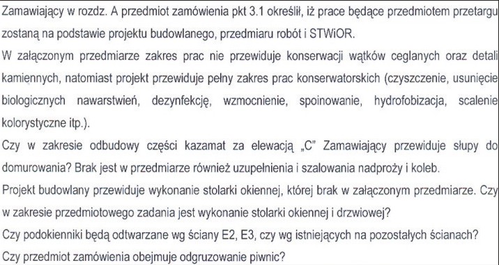 Zgodnie z art. 38 ust. 2 ustawy Prawo zamówień publicznych poniżej przedstawiam treść zapytań wraz z odpowiedziami do zamówienia Renowacja i odtworzenie fragmentu elewacji i kazamat dziedzińca Donjonu w Twierdzy Srebrna Góra w ramach zadania pn. Twierdza w Srebrnej Górze – renowacja południowej części Donjonu