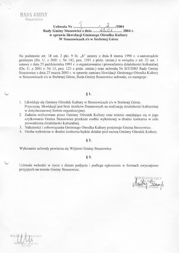 Uchwały:Uchwały Rady > 2004 > styczeń > I/ 2 /2004/04 z dnia 2004-01-29w sprawie : likwidacji Gminnego Ośrodka Kultury